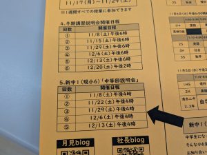 「冬期講習説明会」(小4・5・中1・中2対象)の開催日程に加え……「小6(新中1)中等部説明会」日程が掲載されています!そうです!!月見校ではオリジナル企画「来年中学生になるお子様をお持ちのご家庭向け説明会」を11/8(土)からスタートしていきます!!