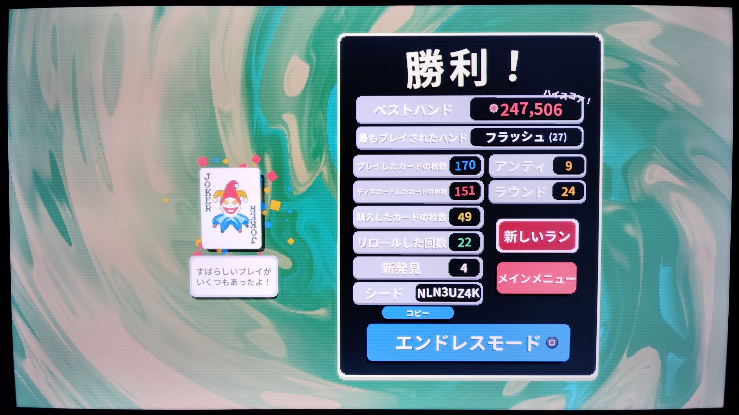 ゲームルールは、トランプのポーカーの手役を作って、それに手持ちの様々なバフカード (有利な効果のあるカード) が発動して、得点が決まるという物です。色々な制限のある中で目標点をクリアすると先のステージに進みます。3×8=24ステージをクリアすると勝利となるようです。