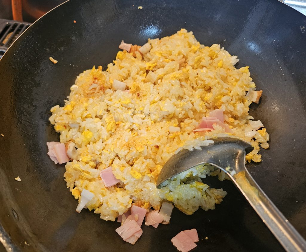 ご飯と卵をよ~く混ぜながら、ほぐしながら~炒めていきます。