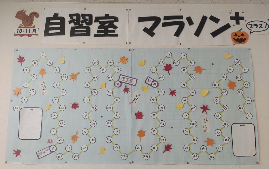 秋が深まり、だいぶ涼しくなってきました。季節の変わり目に風邪などを引かないよう、服装などを工夫するようにしてください。さて、10/29(水)にスタートする秋季講座に先駆けて、自習室マラソンを実施します。