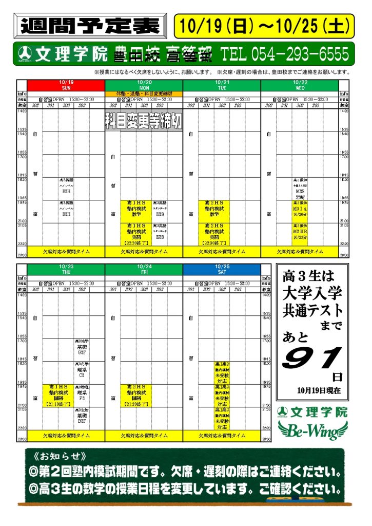 来週は塾内模試期間になります。高校1.2年生は通常授業がありません。また普段通っていただいている曜日と違う日が受験日になっているクラスもございます。ご注意ください。また、受験に際し遅刻・欠席等ある場合はご連絡ください。振り替え受験の日程を決めさせていただきたいと思います。