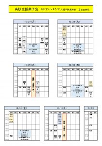 富士吉田 高校生 授業予定 富士吉田 高校生 授業予定 10/27~11/2 今週は塾内模試の週です 高1 10/27 (月) 20:00~22:30 国語・数学 10/28(火) 20:00~21:25 英語 21:35~22:15 吉田(普)1年 進路ガイダンス 欠席者予備日 10/29(水) 高2 10/30(木) 19:50~22:40 10/31 (金) 20:00~21:25 21:35~22:15 吉田(普)2年 進路ガイダンス 欠席者予備日 11/1(土) 予定日に必ず受験してください。