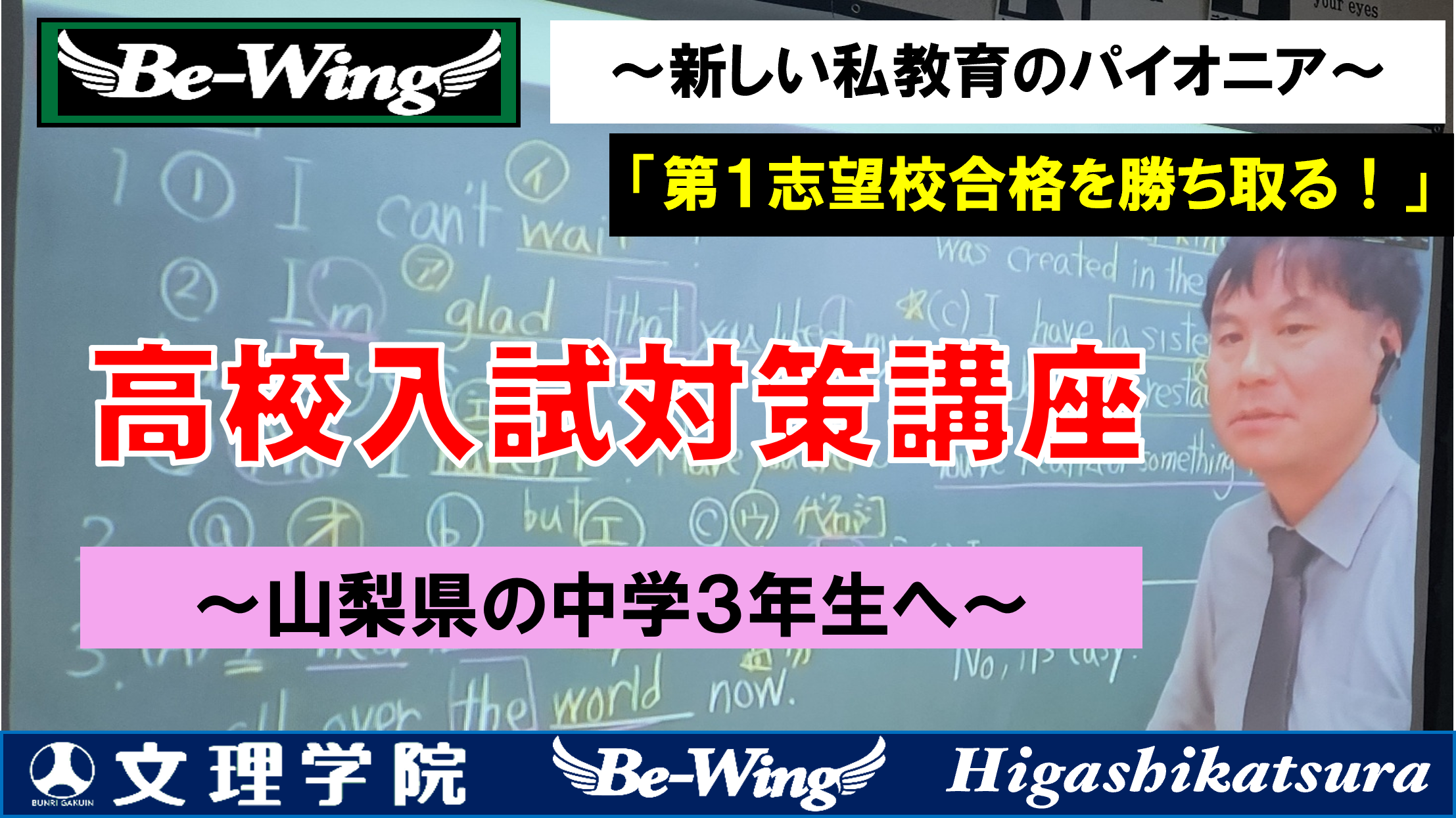 文理学院Be-Wing小中学部専門校3校である東桂校・大里校・石和校では、、Be-Wing山梨限定の土曜入試対策講座を開講しています。受験科目すべてを各校の校舎長による対面授業形式で行っています。Be-Wing専門校だからこそ実現できる最新の指導システムで、実力テストに向けて徹底的に指導させていただきます。教達検テスト、校長会テスト、そして高校入試へと向かう生徒たち一人ひとりに対して、従来のBe-Wingによる受験対策授業はもちろん、経験豊富な実力講師陣が対策授業を直接担当いたします。パワーアップしていくBe-Wing専門校各校の授業にご期待ください!