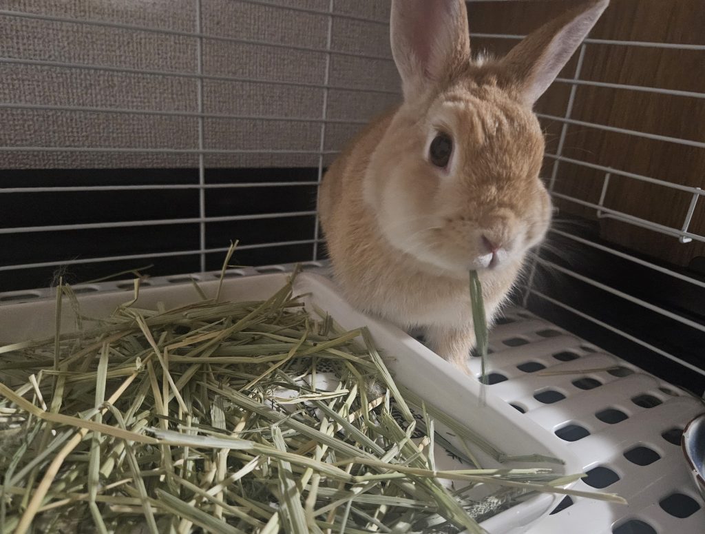 ご飯と牧草の袋を持って近づくと、ゲージにつかまって二本足で立ちます。笑