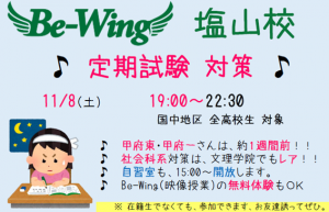 ♪ Be-Wing 塩山校のみなさん並びに国中地区高校生のみなさん、特に甲府東高さん・甲府一高さんは定試約1週間前になりまして、本年度の定期試験も3/4、つぎの学年末・来年の定試・その先の受験を見据えて第3回定期試験、ふんばってまいりましょう。「まだ土・日があるじゃないか」なのか「もう月曜に始まっちゃう」のか、「もう一問解いとく」のか「ここまでにしとく」のか、「文理に来る」のか「来ない」のか、悩んでるんなら塩山校舎で恒例の定期試験対策しちゃいましょ。11/8(土)19:00~効率重視のBe-Wingで今回もいい成績狙っときましょ。社会科系の対策ができるのは、文理の中でもかなりレアでっせ。