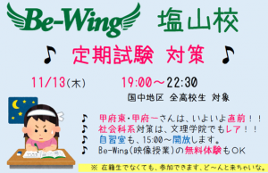 ♪ Be-Wing 塩山校のみなさん並びに国中地区高校生のみなさん、お元気でしょうか?特に甲府東高さん・甲府一高さんは定試約1週間前になりまして、本年度の定期試験も3/4、つぎの学年末・来年の定試・その先の受験を見据えて第3回定期試験、ふんばってまいりましょう。「まだ土・日があるじゃないか」なのか「もう月曜に始まっちゃう」のか、「もう一問解いとく」のか「ここまでにしとく」のか、「文理に来る」のか「来ない」のか、「自力」なのか「他力」なのか、悩んでるんなら塩山校舎で毎度毎度の定期試験対策しちゃいましょうよ。11/13(木)19:00~効率重視のBe-Wingで今回もいい成績狙っときましょ。社会科系の対策ができるのは、文理の中でもかなりレアでっせ。