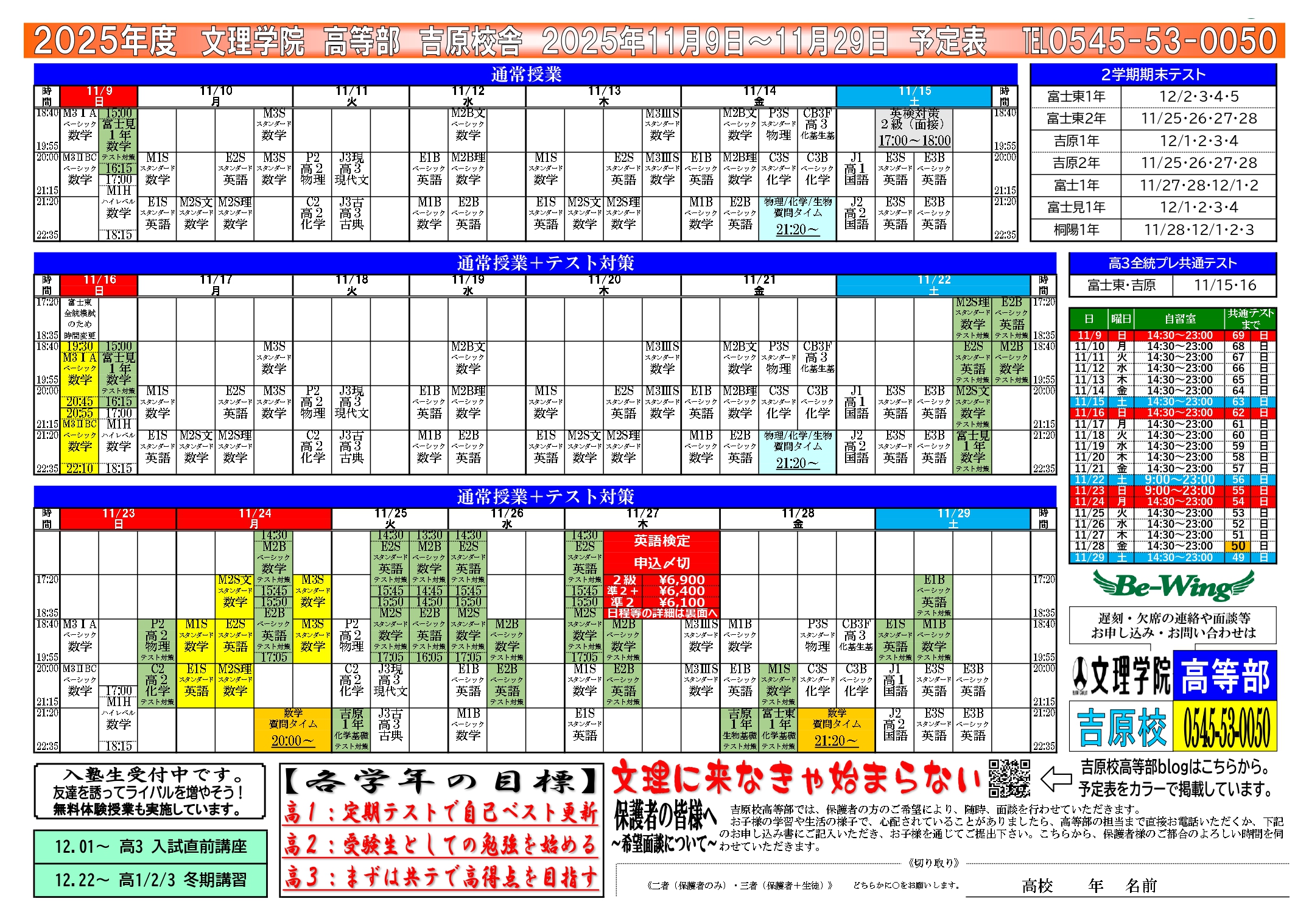 【吉原校高等部】11月9日以降の予定 こんにちは。吉原校高等部です。 11月9日以降の予定です。定期テスト対策が始まるので、確認してください。 また、英検の申し込みを受け付けております。27日締め切りです。 高1で準2級以上、高2で2級以上がとれるように受験しよう!文理では対策も行っておりますよ! (若山)