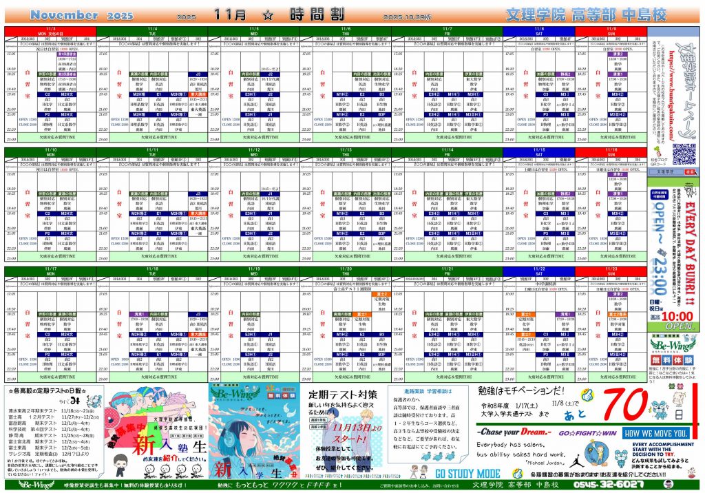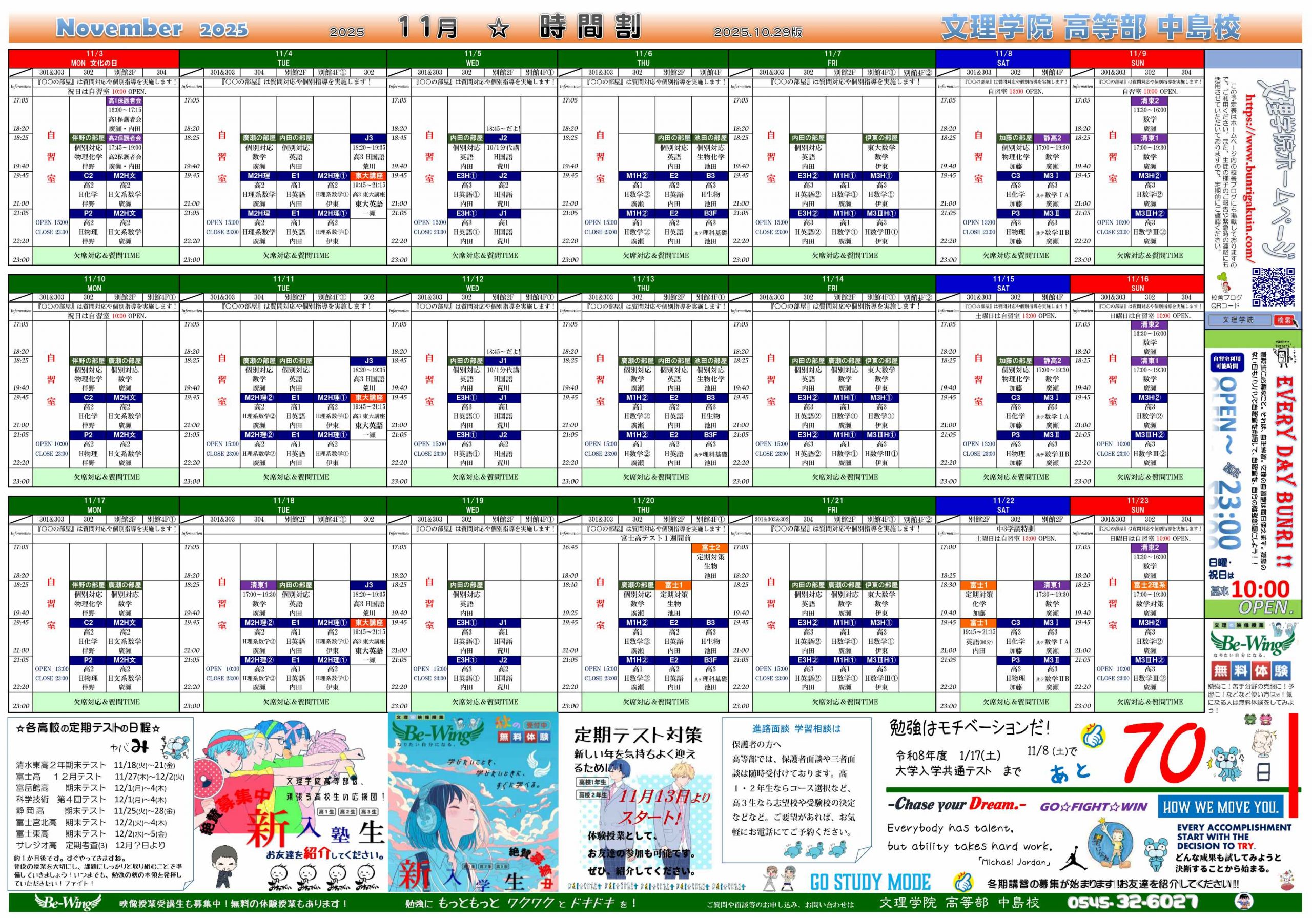 【高等部 中島校】11/3~の予定 こんにちは。廣瀬ですヽ(^◇^*)/ 昨日は、高1・2の保護者会でした。参加していただいた保護者・生徒のみなさん、ありがとうございました。今後のモチベーションアップや家族で進学に向けての話のキッカケとなってもらえると幸いです。参加できなかった方向けに後日アーカイブのURLをお知らせしますので、お時間のあるときにご覧ください。 以下、11/3~の予定表となります。次は12月テスト・期末テストに向けてです。風邪などが流行っているようです。体調に注意しつつガンバっていきましょう! ではでは。