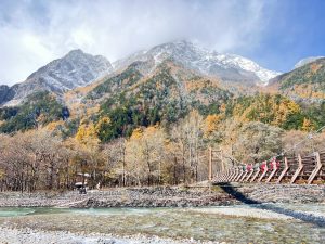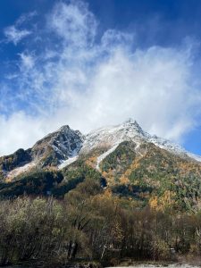 沢渡バスターミナルからタクシーで出発し、揺られること30分。しばらくは快晴で、車窓から絶景の紅葉を楽しんでいました。ところが、もうすぐ上高地となるトンネルを抜けた瞬間、景色が一変!雪化粧した上高地の森が広がっていました(;^ω^)笑