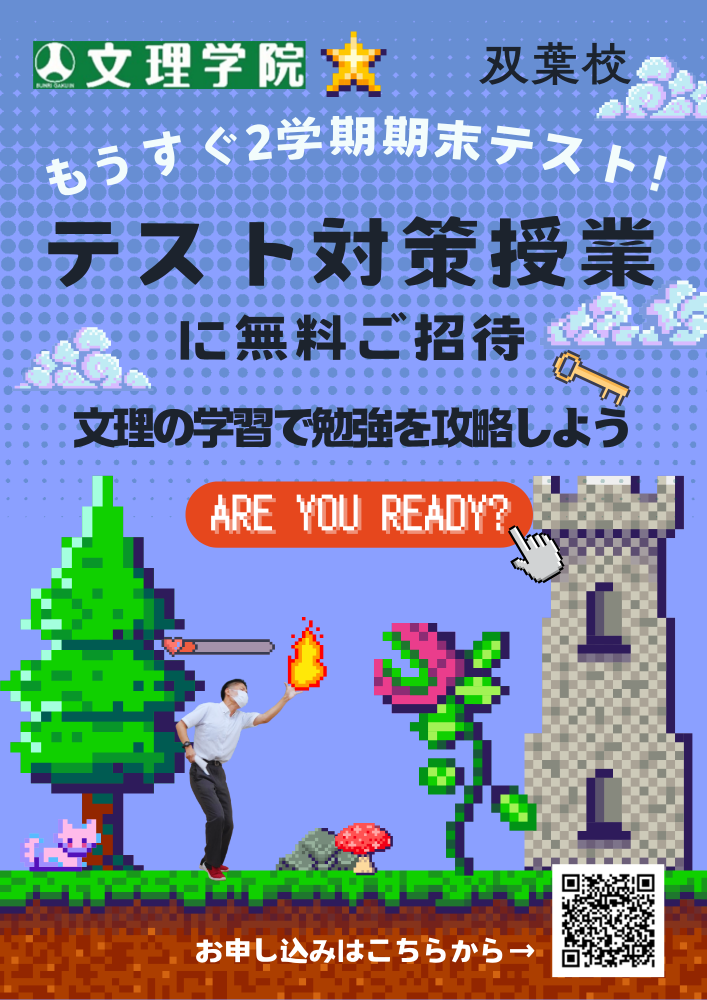 さて、文理学院双葉校では、普段文理にに通っていない生徒さんを、テスト対策授業に無料ご招待しております!