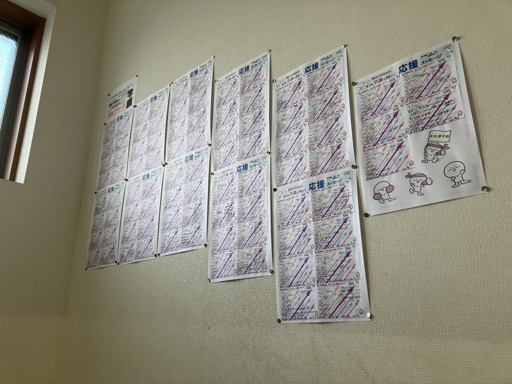 2階に上がる階段の壁に掲示されていますので応援メッセージを中3生は見てみてください。きみたちを応援しているのは皆さんの保護者や先生たちだけではありません。先輩たちもエールを送ってくれています。