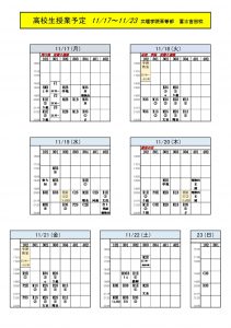 富士吉田 高校生 授業予定 富士吉田 高校生 授業予定 11/17~11/23 河口湖高校、吉田高校、富士学苑高校 定期テスト2週前になります 北稜高校は21日よりテストです 対策授業が目白押しとなる今週は 各自計画に沿った準備が必要です 出題ポイントを授業で確認し 集中して進めていきましょう