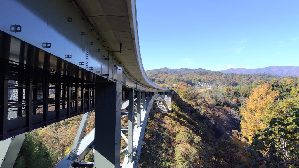 ↑天竜峡の大橋「そらさんぽ」からの絶景と…