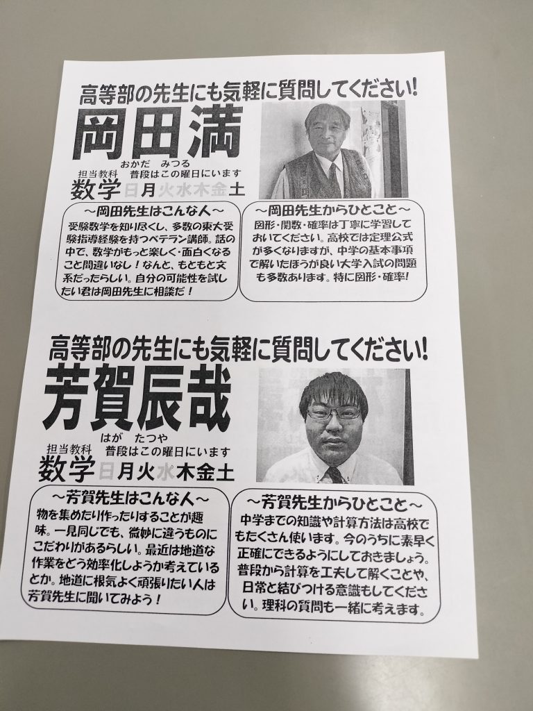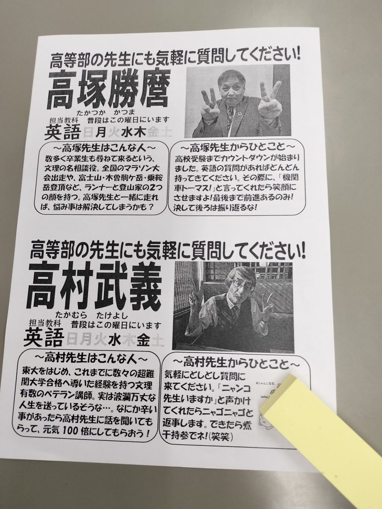 高等部教師の顔写真、プロフィール、中3への応援メッセージを載せたものを今週から中3生に配布しています。