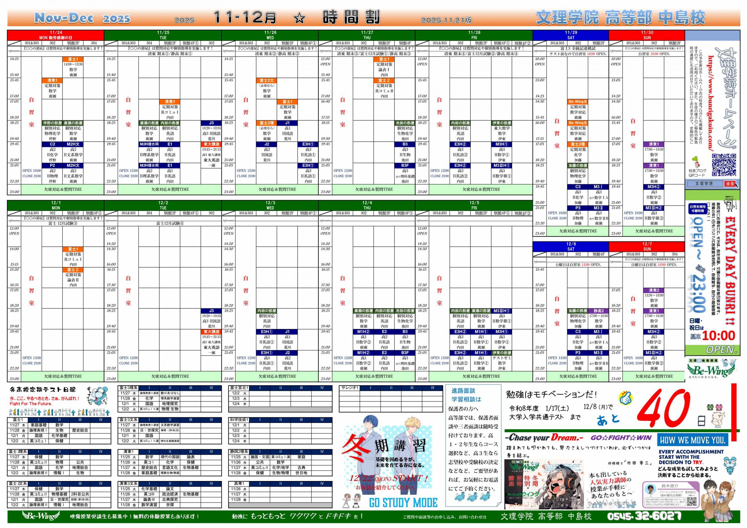 【高等部 中島校】11/24~の予定 こんにちは廣瀬ですヽ(^◇^*)/ 11/24(月)からの予定表をになります。年内最後の定期テストが始まります。2025年を締めくくるテストとして本気のマジで臨みましょう! なお、テスト日程不明の高校があるため、時間割の変更の可能性がありますのでご了承ください。 現在、冬期講習受講生募集中です。以下バナーより詳細がご覧いただけます。