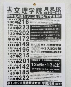 月見校は体験授業を受ける生徒、12月入学の生徒、冬期講習に申し込む生徒……この冬、がんばりたい生徒諸君がたくさん集まってきています。今日も中2で2名体験に!!また、中3も木曜日の学調へ向け最後の対策授業です。がんばっていきましょうね!!