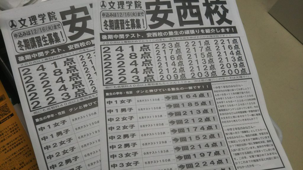 12/5(金)に安西校のお手製白黒チラシが折り込まれます!!中3の学調結果も入れたかったなぁなんて思うのは欲張りすぎですかね。今回もみんなの頑張りが伝わるように作成しましたのでお楽しみにお待ちください!!