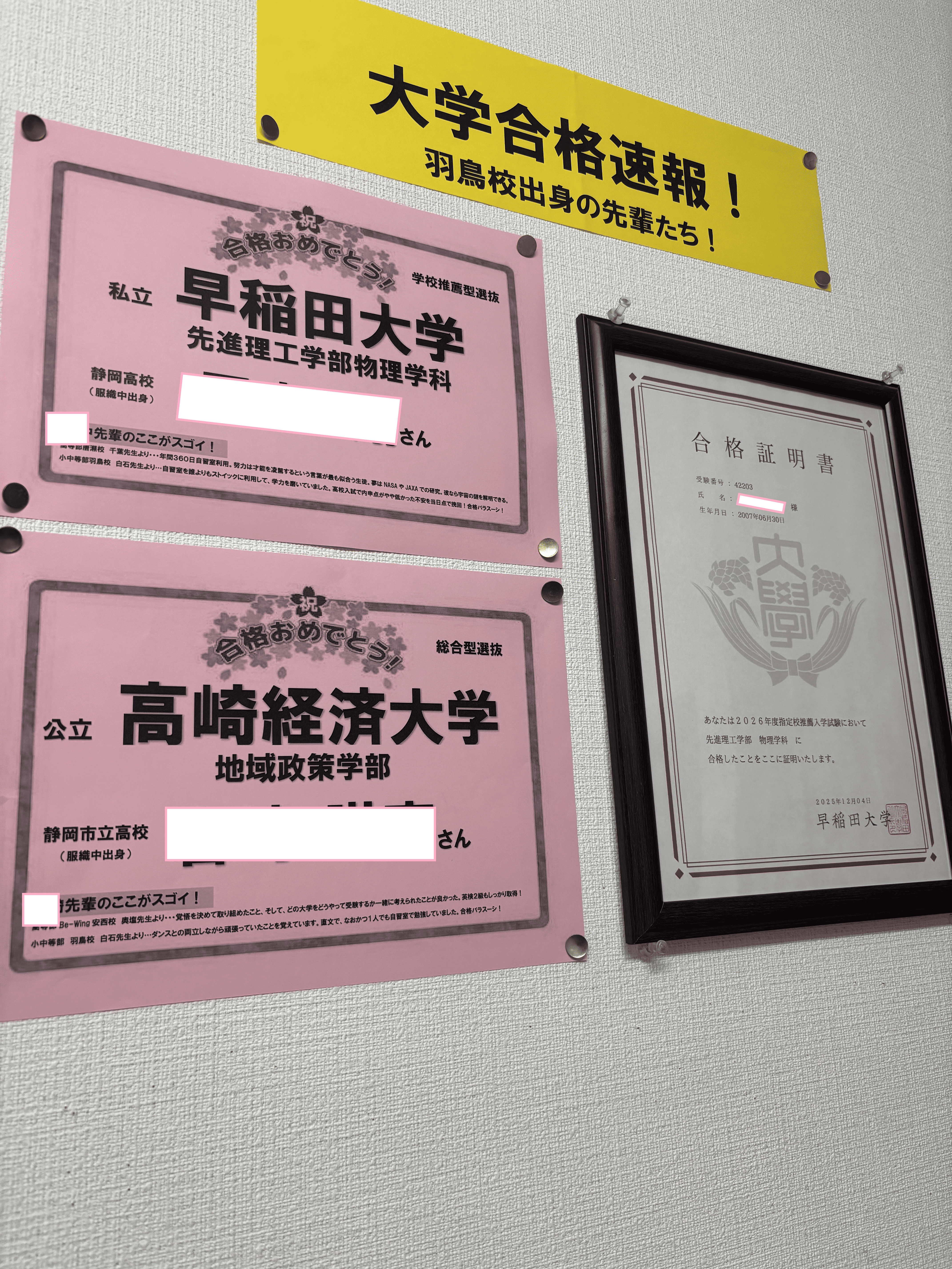 嬉しい知らせが届きました!早稲田大学と高崎経済大学の合格の知らせです。早稲田に合格したAくんは、自習室の主でした。ほぼほぼEvery day文理でした。入試の次の日には自習室にいた記憶があります。唐瀬の高等部の千葉先生経由で合格証のコピーをいただきました!そして、高崎経済に合格したBさんは直文(家に帰宅せず直接文理に寄る)の人でした。また一人で勉強できるタイプでした。ちなみに、2人とも2020年に新中1として入学した世代です。この世代は2020年の4月からコロナ禍により対面授業ではなく、Live配信授業でした。豊田校から授業配信をしていたのも懐かしい思い出です。本当に合格おめでとう。唐瀬校高等部と安西校高等部のスタッフにもここから感謝します。※AくんBさんのご家庭から校舎内掲示の許可をもらっています。
