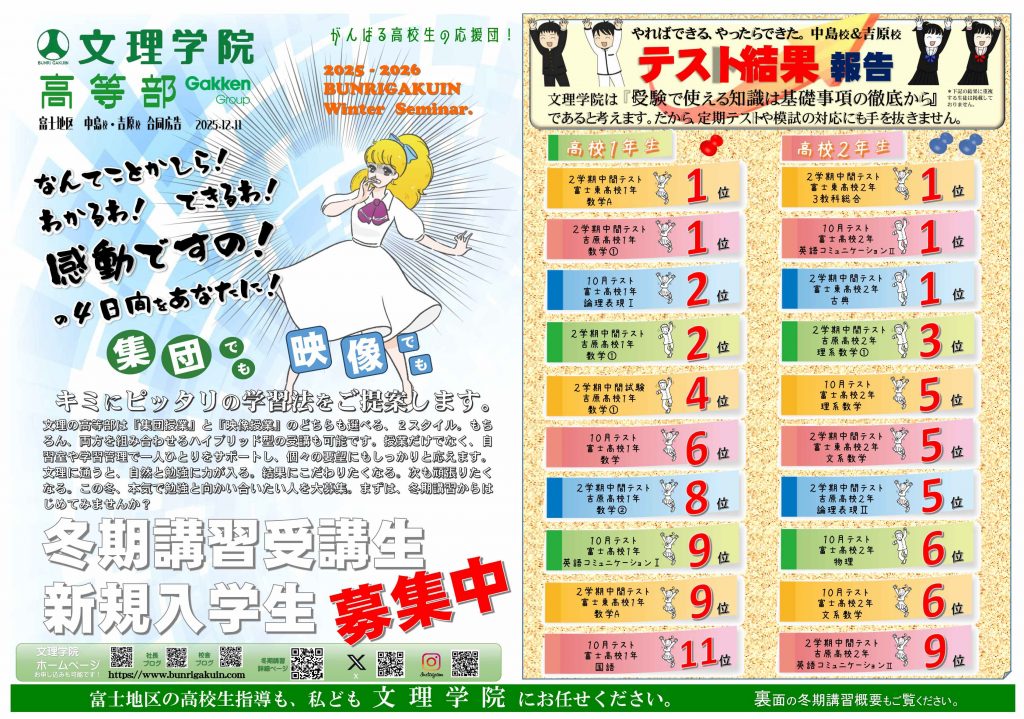 本日12/11(木)の朝刊に中島・吉原合同の折込広告が入りました。今回の広告では2学期中間テストの結果と冬期講習の案内を掲載しました。それがコチラになります。