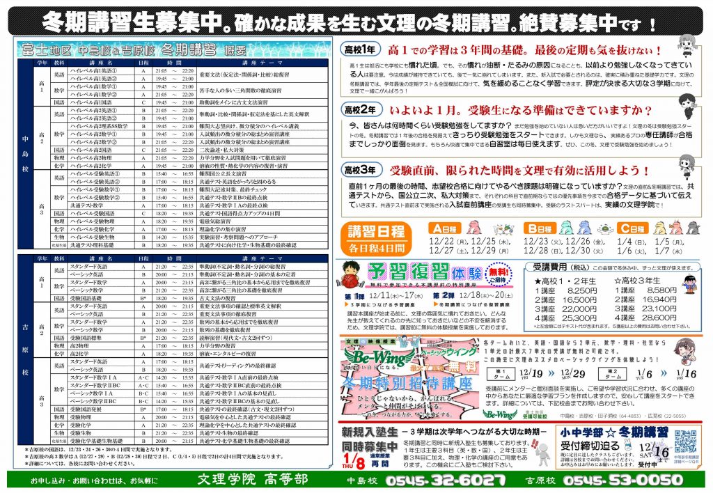 冬期講習については、本日より講習前の予習・復習体験がスタートします。講習申込みは直前まで可能となっていますので、ご希望の方は校舎までお問い合わせください。以下のリンクからもお申し込み可能です。小中学部の講習申し込みも12/16まで可能となっております。