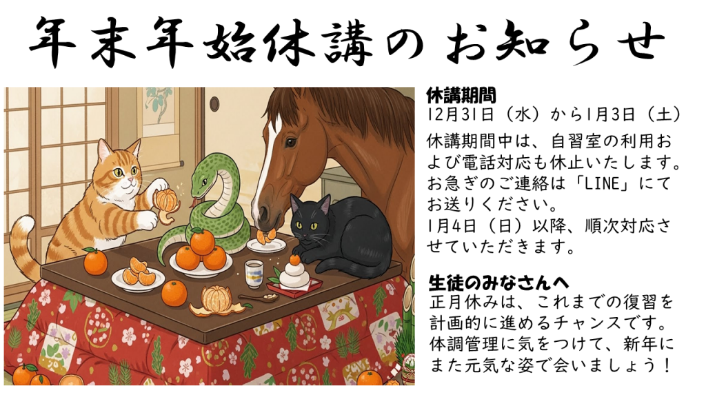 さて、今年の授業も今日を入れてあと3回です。今日も朝から小学生が元気いっぱい通塾してくれました。中3生は長丁場ですが、最後まで集中力を切らさず頑張ってくれましたね。今から中1・中2の授業です。学調はすぐそこです。集中して頑張ってください。