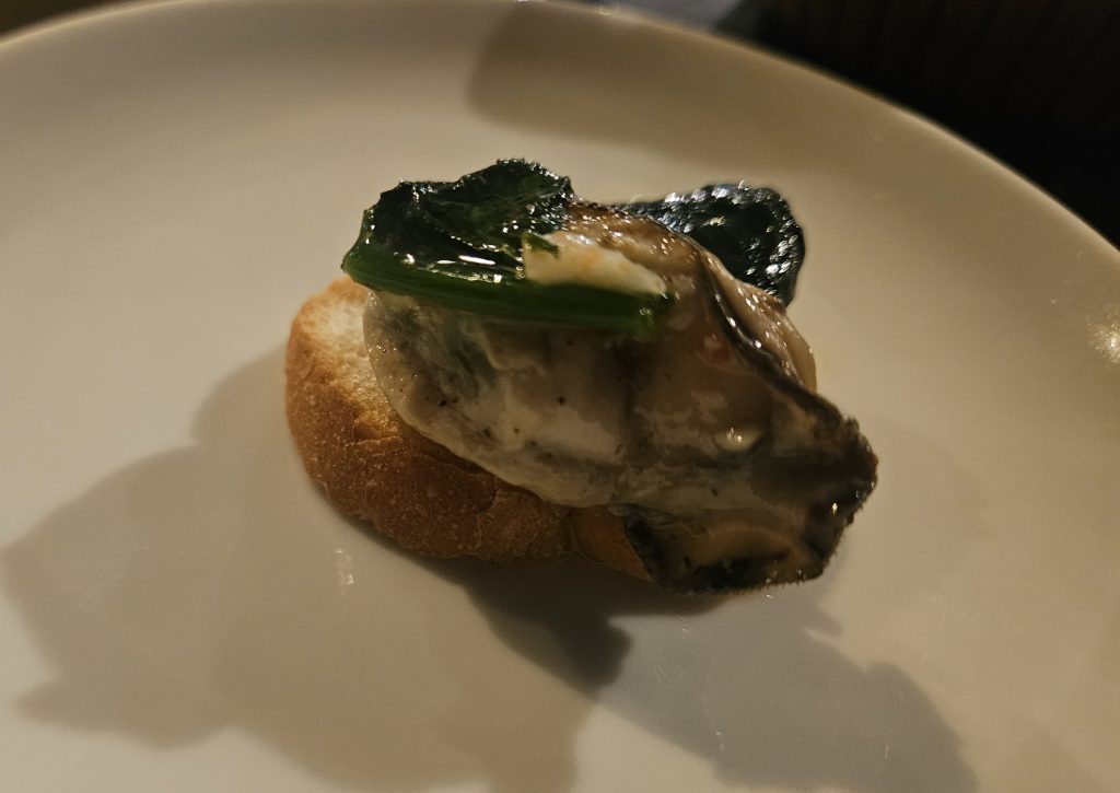 パンにオリーブオイルをかけて、牡蠣とほうれん草・トマトをのせてパクリ(o^^o)