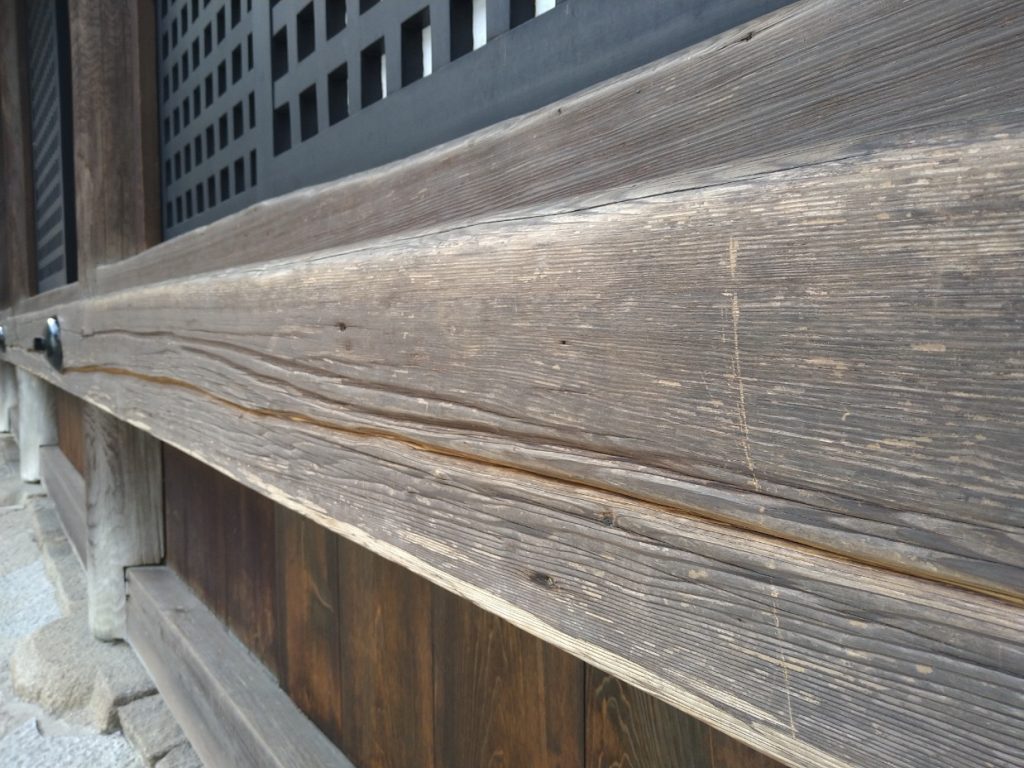 下の写真は清水寺の本堂です。本堂軒まわりの長押(なげし)に木目に沿って溝があります。『弁慶の指跡』と呼ばれていますが、昔、夜お百度参りに来た人たちが暗闇の中で本堂の周りを手探りで歩いた時につけた擦り傷だと言われています。『堂々巡り』という言葉は、このお百度参りに由来するそうです。