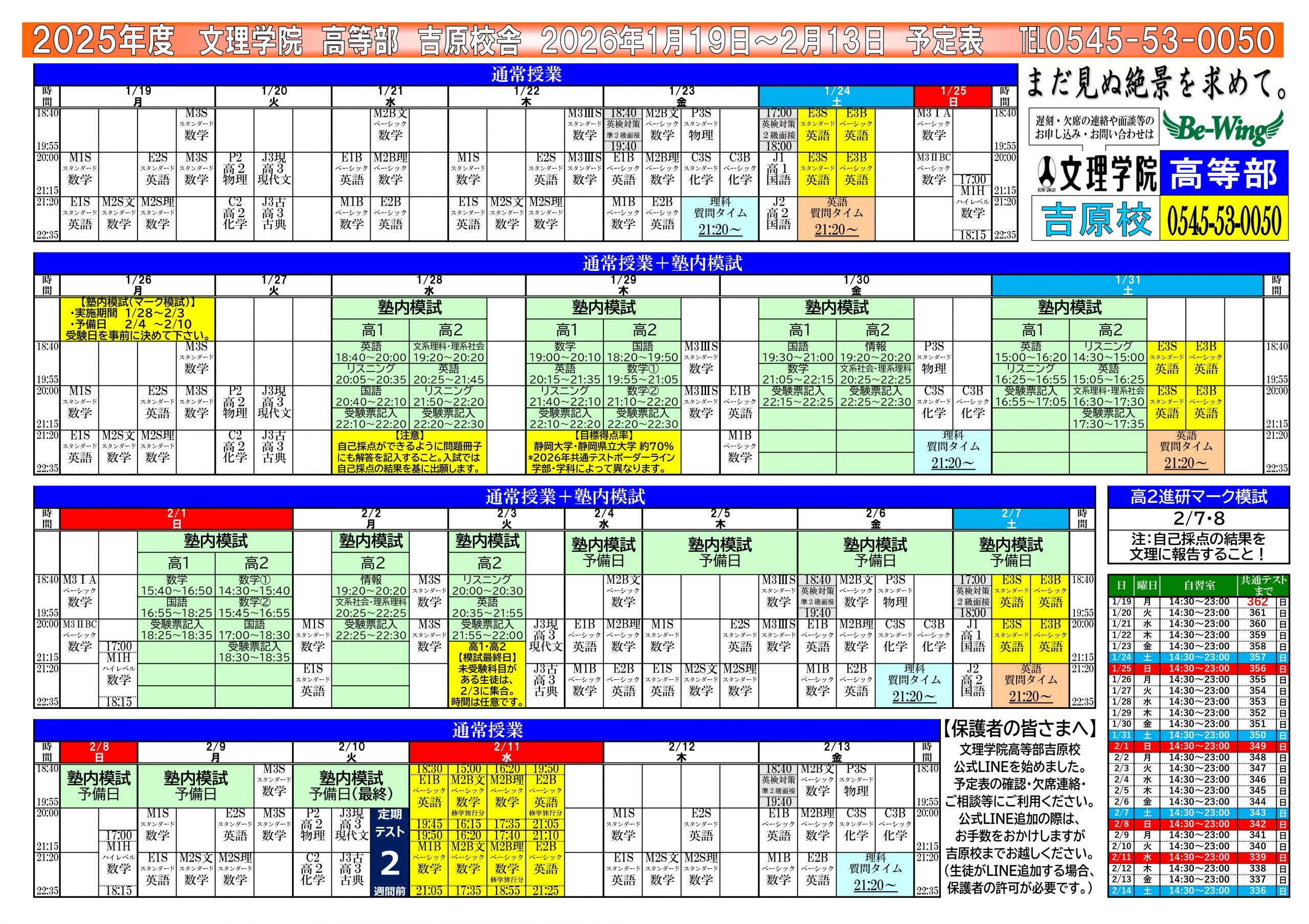 【吉原校高等部】1月19日以降の予定表 こんにちは。吉原校高等部です。 1月19日以降の予定表です。 塾内模試が行われます。模試とは、自分の学力がどのくらいあるか測る健康診断のようなものです!ぜひ、前向きな姿勢で挑んでください! *高1:国語・数学・英語・リスニング *高2:国語・数➀・数➁・英語・リスニング・情報・社会(文系2科目/理系1科目)・理科(文系1科目/理系2科目) 模試期間で、すべての科目を受験してください。