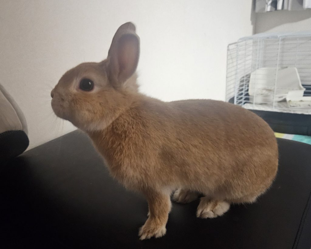 部屋の中を一通りパトロールをしたら、ゲージに撤収して牧草タイムに入ります。