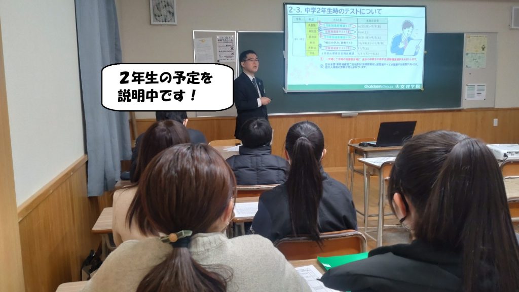今日から、中学生向けの保護者会が始まりました! 今日は中1、来年度からは中2になりますので、中だるみしないようにするための生活のしかたであったり、今後の授業の予定であったりと、盛りだくさんです!