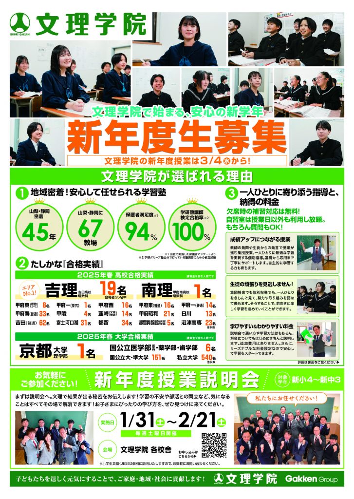 【河口湖】新年度新入塾受付中! 皆さんこんにちは!河口湖校の渡辺健です。 文理学院河口湖校では3月4日(水)から新年度授業が始まります。 新年度最高のスタートを切ろう!お気軽にお問合せください。 ★★★ 河口湖の生徒が掲載されました ★★★ 河口湖校の中学1年生の皆さん、自分が写っていますかね? ★★★ 新年度募集のCMが完成しました ★★★ 生徒たちの協力のもと、素晴らしいCMが完成しました。ぜひ、ご覧ください。下記の画像をクリックすると見ることができます。