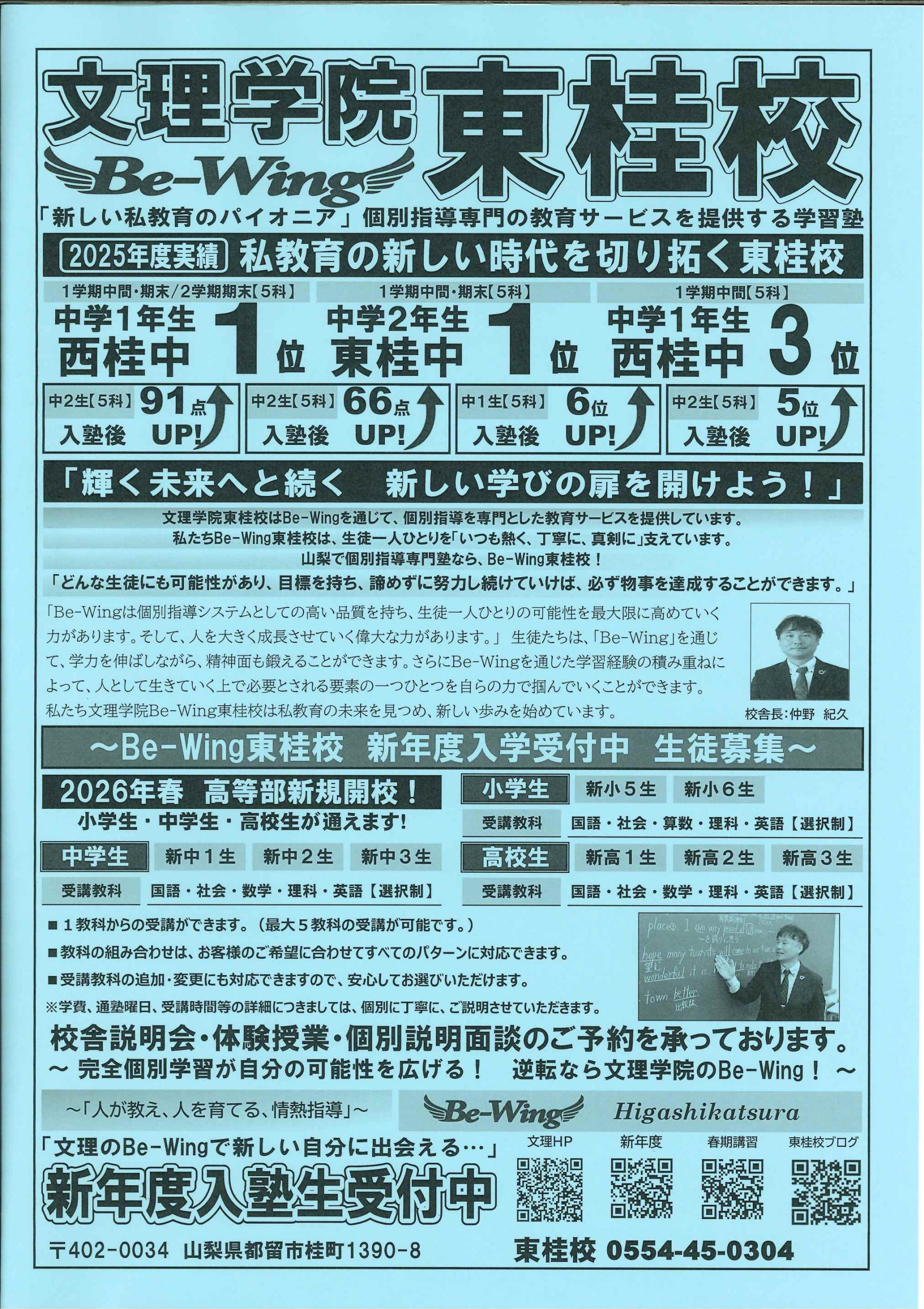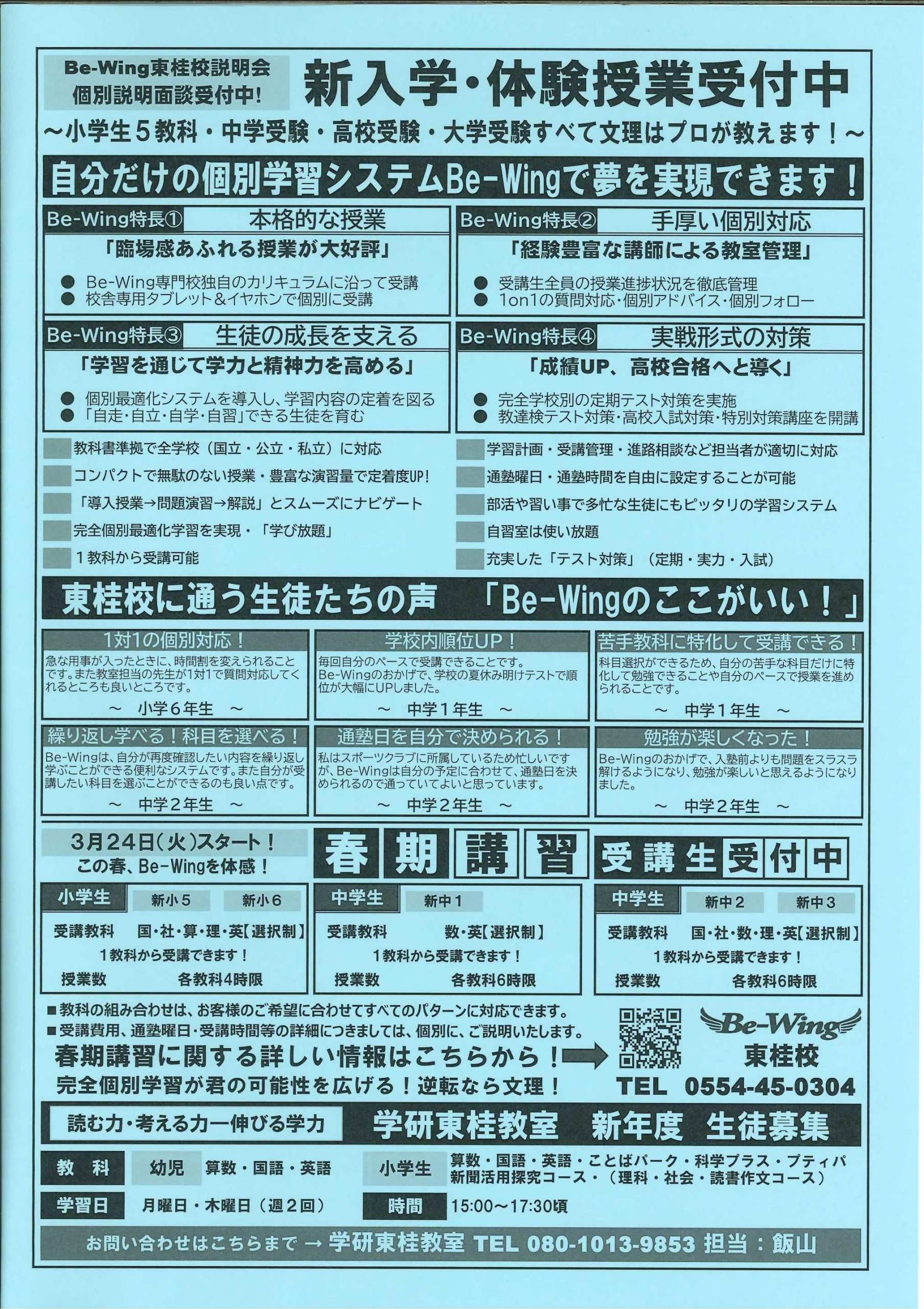 本日3月7日(土)はとても暖かく心地よい春の訪れを感じる一日です。今日は午前中に、自宅のある地域の方々と自治会のことで触れ合う機会があり、地域の人々の心のあたたかさを感じながら出社しています。さて来週3月13日(金)に、Be-Wing東桂校の春期チラシが出ます!Be-Wing春期講習スタートのご案内はもちろん、今年度から開校するBe-Wing高等部のご案内も同時掲載させていただいています。