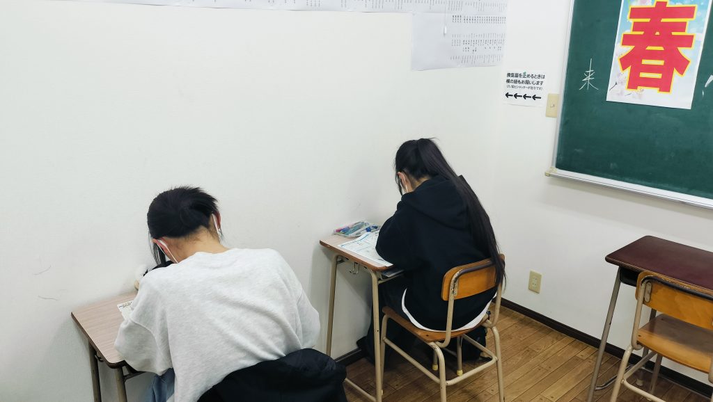 ワックスがけ直後に自習室にやって来た中学生二人組です。集中して勉強しています。ワックスがけ効果かな?