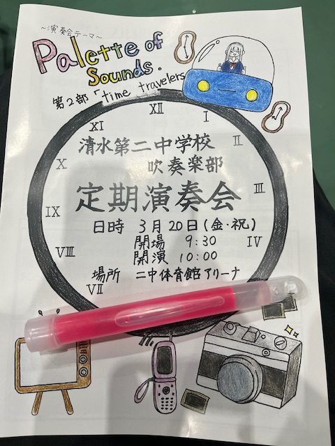 パンフレットも頂きました。一緒に写っているのはサイリウム。今は中学校の演奏会でも使うんですね… 時代を感じます。