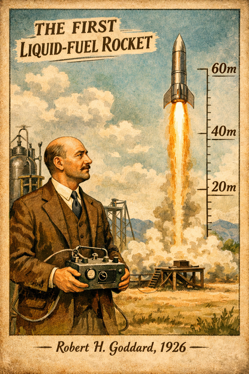 1926年3月26日にロバート・ゴダードは、世界初の液体燃料ロケットの打ち上げに成功し、約60mの飛行を達成しました。