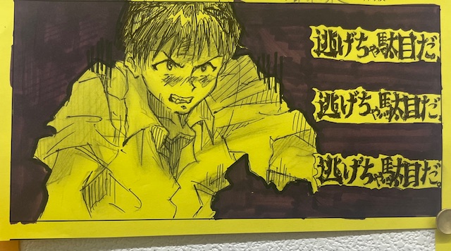 新世紀エヴァンゲリオンの碇シンジくんですね。吉川先生や住谷がエヴァ好きと知って描いてくれたのかな…?