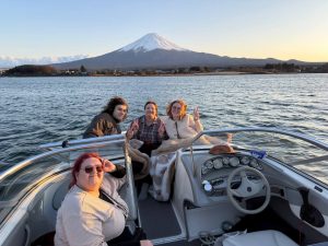 河口湖ではスピードボートに乗り、本栖湖では夕日を眺め、山中湖では夜に映る逆さ富士を見ることができました。