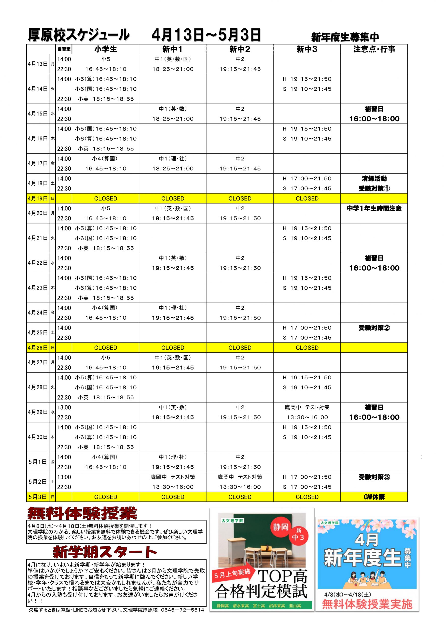 以下が月間予定表になります。ご確認ください。