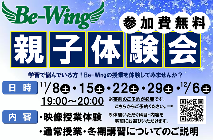 ※学費、通塾曜日、受講時間等の詳細につきましては、個別に丁寧に、ご説明させていただきます。まずは、Be-Wingの体験授業を受けてみてください!