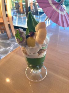 抹茶パフェ。一口入れた瞬間「抹茶!」って感想が出るくらい濃い抹茶味でした