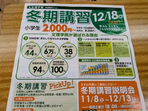 冬期講習のチラシが届いていました!この1年「販売促進Projectチーム」がWebを含めた広告関連をリードしてくれ、集客に関する成果も出始めており……今回も今までにない感じの清潔感ある仕上りとなっております。みなさま、冬期講習はぜひ「文理学院」を選んでくださいね!!このチラシ、静岡市では……いつ出るんだった?(笑)あっ、今月末だな。「Mydo」という情報誌に挟んでみなさんのご家庭へお届けします!