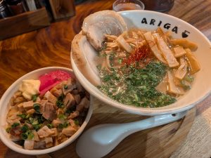 「岡八幡宮」(下清水八幡宮)にはご神木としての大きなクスノキが数本鎮座しており、歴史とパワーを感じさせる場所でした。ラーメンはARIGAさん。味噌ラーメンにはありつけませんでしたが、リピ塩とミニチャーシュー丼で大満足を得ることができました。