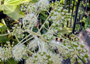 食後、自転車を引いて歩いていると「ヤツデの花」と遭遇。昔は縁起の悪い植物として紹介されていたようですが、今やヤツデは縁起物。花言葉は「健康」「親しみ」、風水でも「邪気を祓い、客を招く」と言われてるそうです。「ヤツ=八=末広がり」といったところも縁起が良いですよね。そのヤツデの花には複数の蜜蜂が。移動途中の出遭いに感謝。