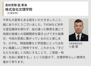 あらためて顧客満足度ランキングでの受賞(高校受験 塾 東海3年連続1位)の文理学院です。一流企業のみなさんと一緒に文理学院の代表としのご挨拶を書いています。写真下のURLも覗いてみてくださいね!