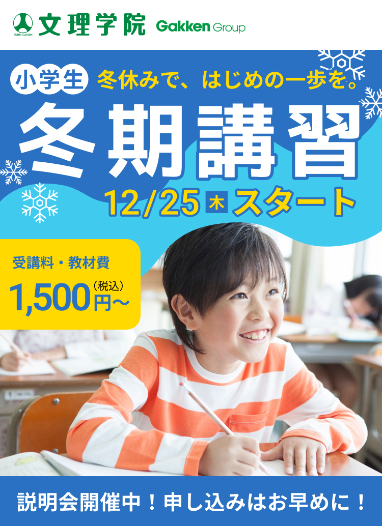 文理学院で成績が上がる秘密&冬期講習の詳細についてお話しします。「お子さまを任せてみたい」と思っていただけたら、冬期講習にお申し込みください。当日はスリッパをお持ちください。