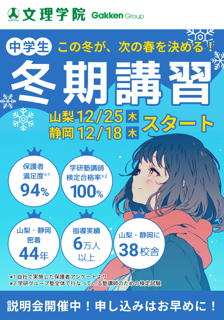 入試直前!志望校合格へ向けて全力でサポートします。文理学院の冬期講習で入試までの限られた時間を有効に使いましょう!山梨県では第2回校長会テストと到達度テストの対策を地域ごとで行います。